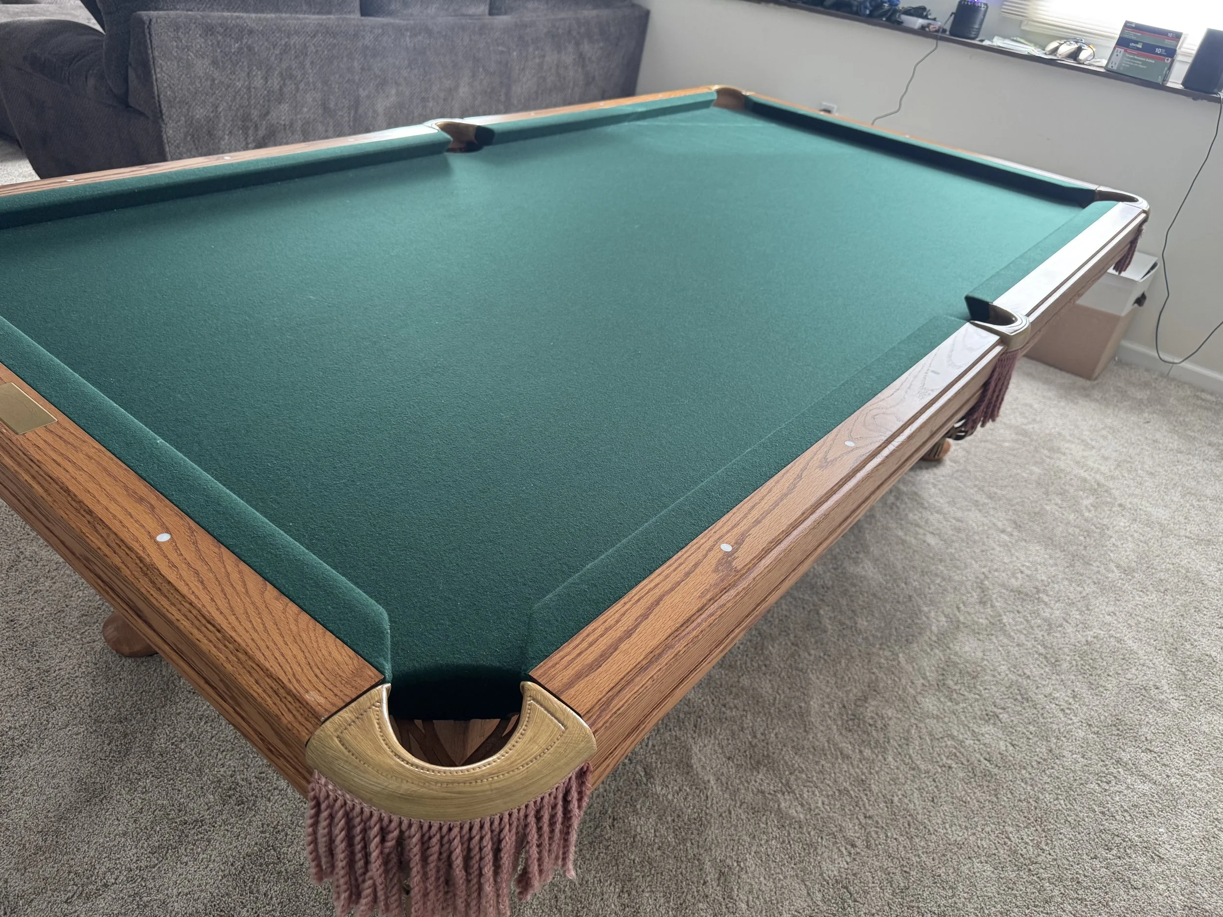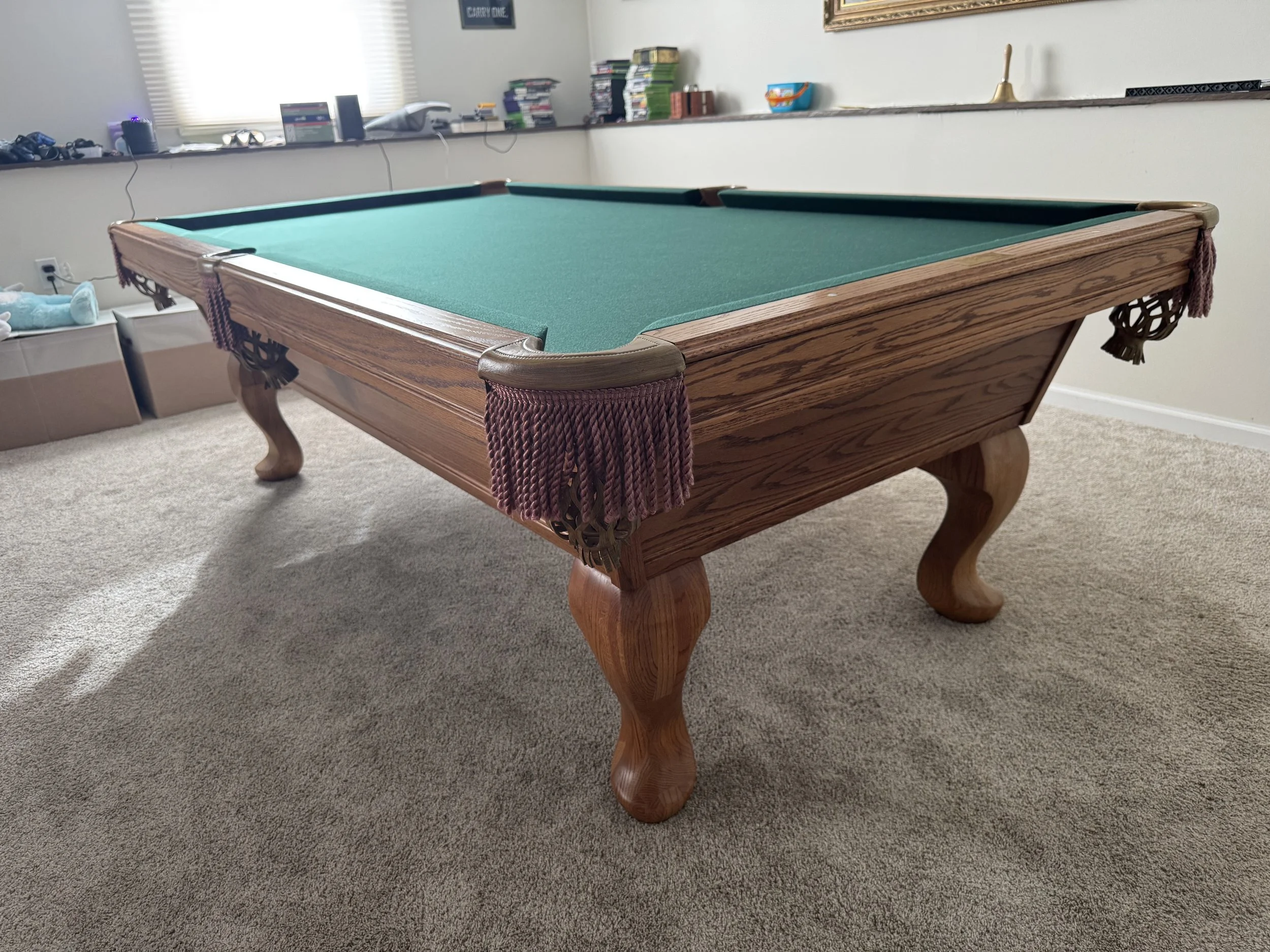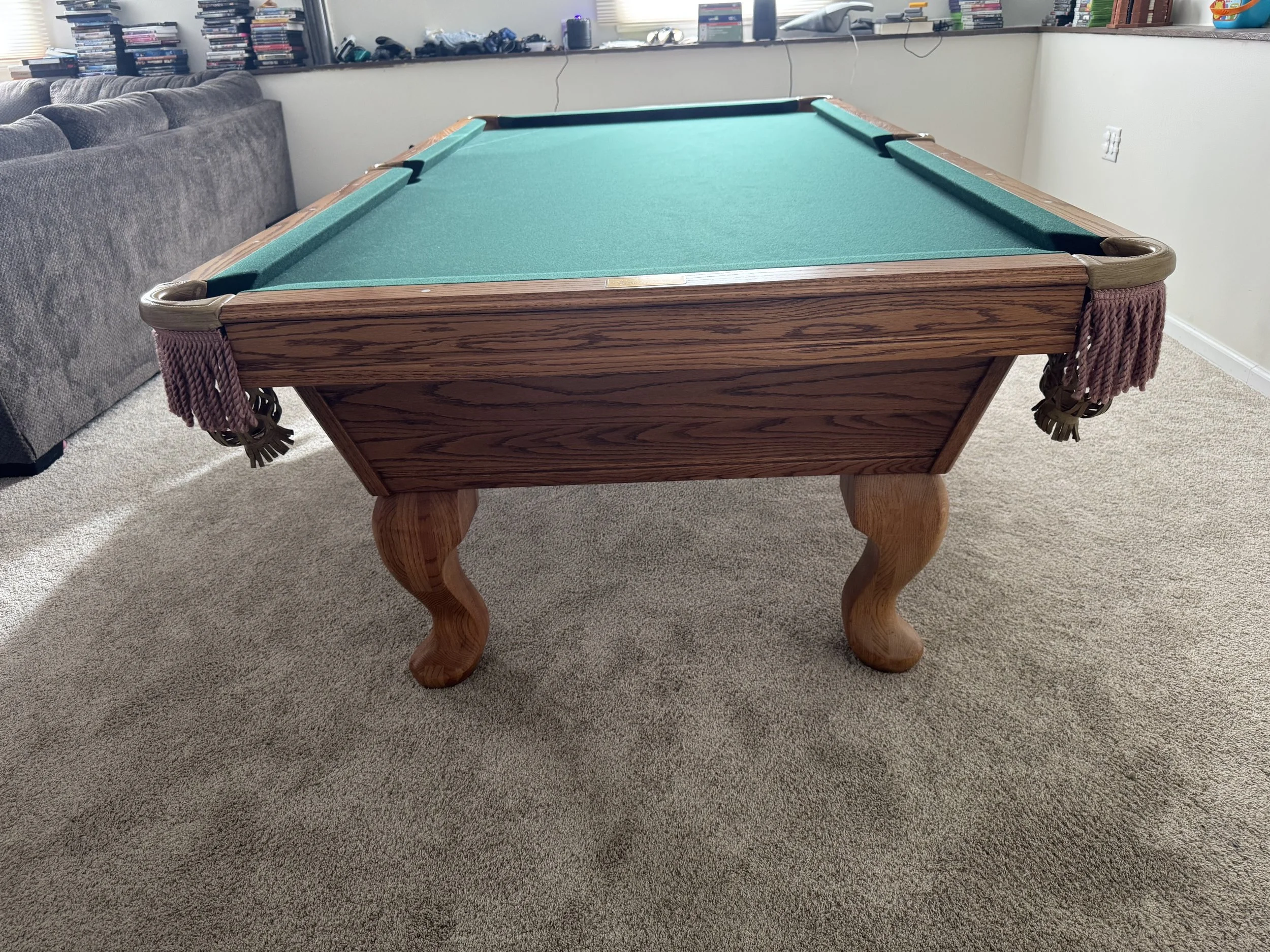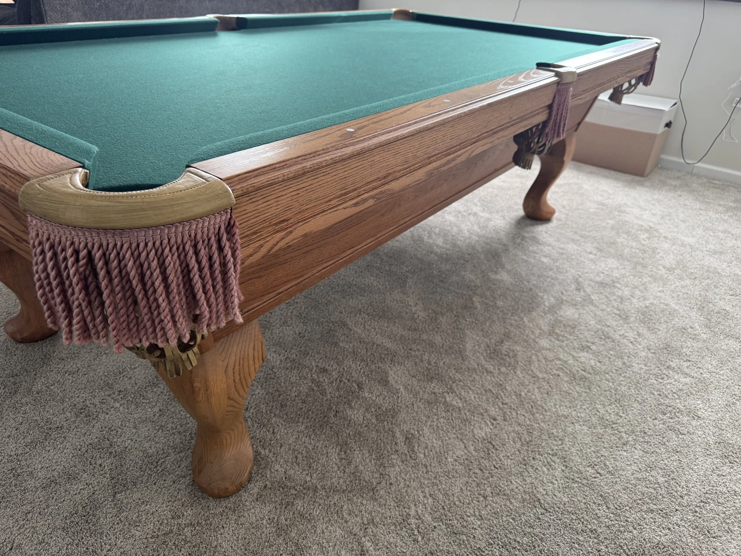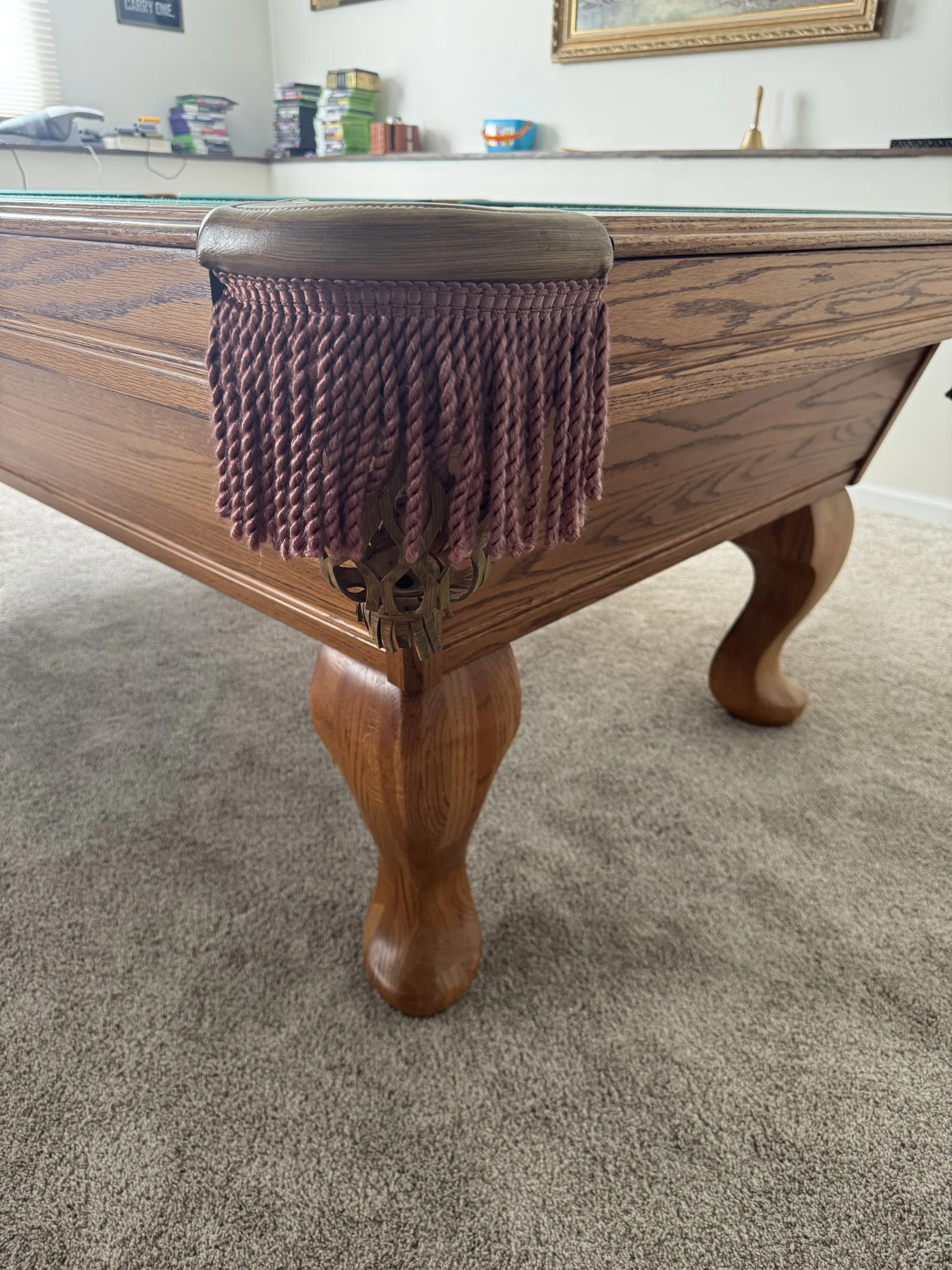 Solid oak cabinet with spoon style legs. Leather and fringe pockets. Round white sites. Table shows little wear with no damage. ** can upgrade the pockets to real leather shield pockets for +$200.