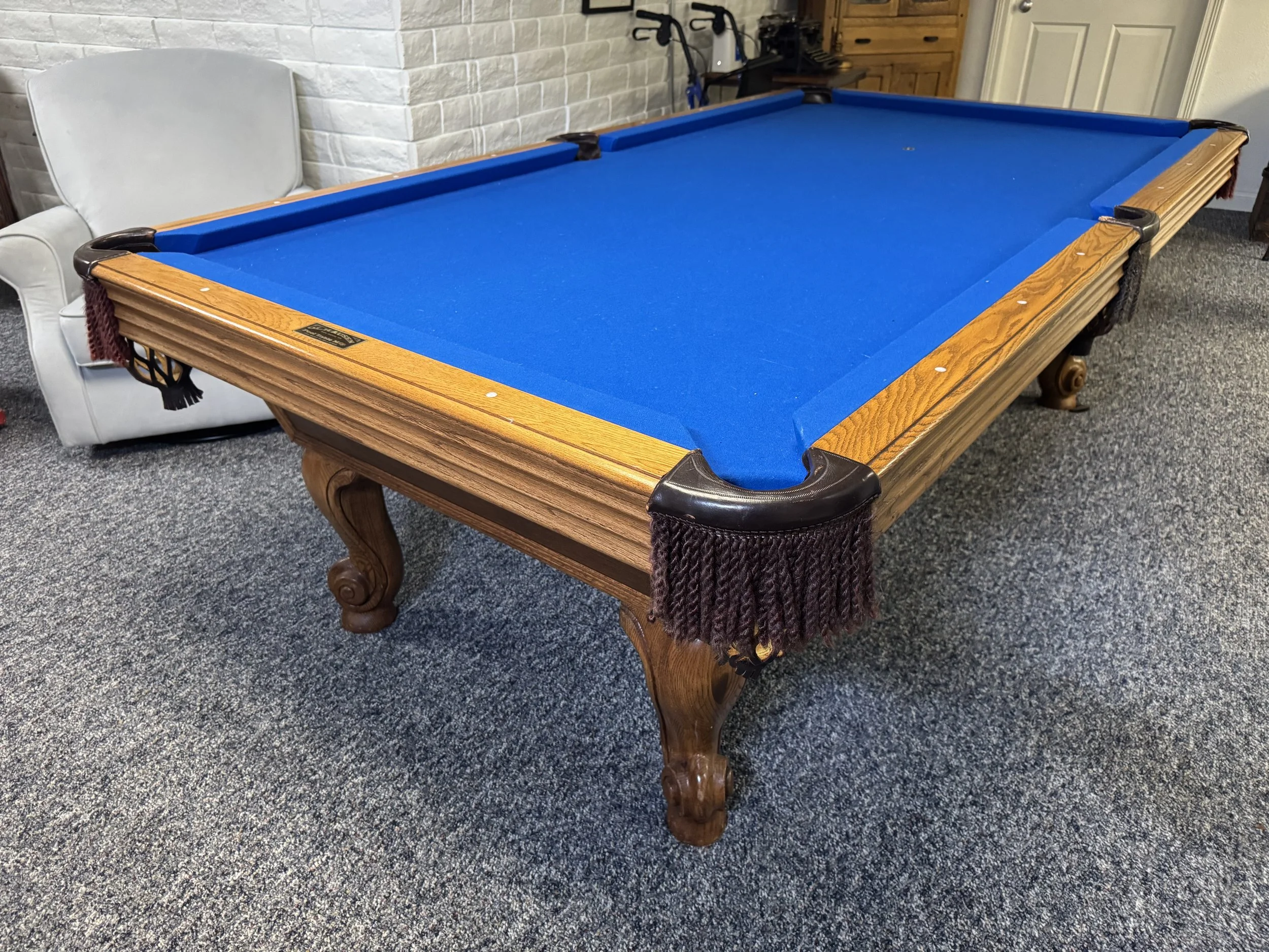 Oak pool table. Medium oak finish. Solid wood rails and skirt. White round peral sites. Oak rams head legs. Will have new rubber installed on the bumpers and new leather pockets